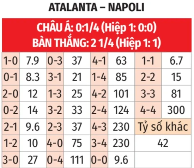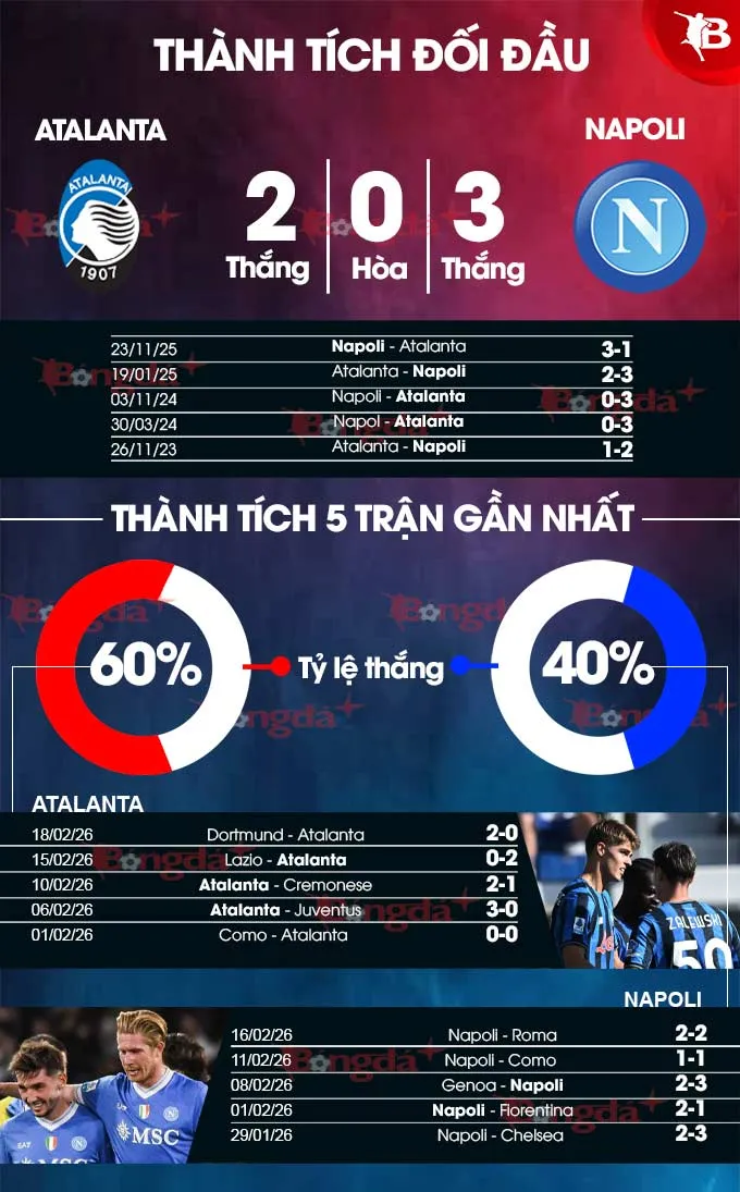 Lịch sử đối đầu cũng đang nghiêng về phía Napoli. Trong 4 lần gần nhất làm khách trên sân của Atalanta, họ đều giành trọn 3 điểm, với chiến thắng 3-2 ấn tượng ở mùa giải trước là minh chứng rõ ràng nhất.