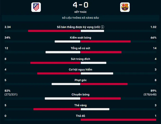 Thảm bại của Barca còn trở nên đắng hơn khi trung vệ Eric Garcia nhận thẻ đỏ trực tiếp ở phút 85, buộc đội bóng xứ Catalan phải thi đấu thiếu người đến hết trận. Kết thúc 90 phút, Atletico Madrid đăng quang với chiến thắng hủy diệt 4-0, qua đó nắm trong tay lợi thế cực lớn trước thềm trận bán kết lượt về tại sân Nou Camp vào đầu tháng 3 tới.