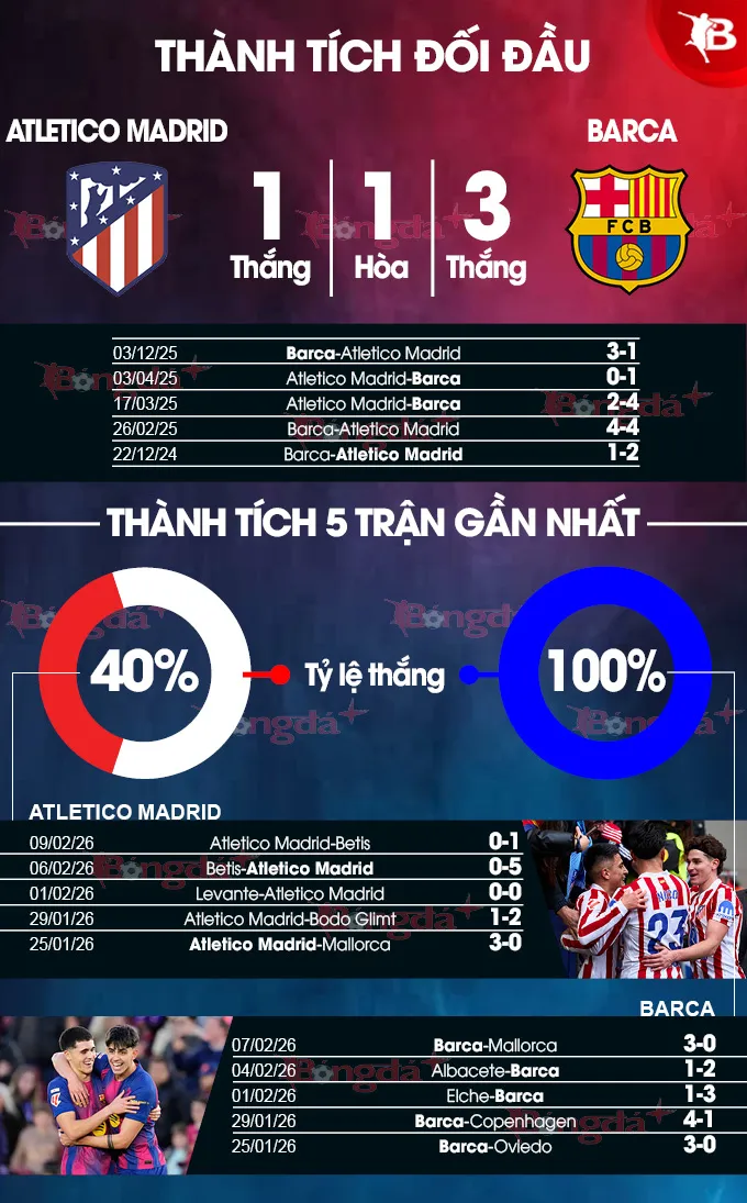 Xét về lịch sử đối đầu, Barcelona đang là nỗi ám ảnh của Atletico Madrid. Trong 10 lần chạm trán gần nhất, đội bóng xứ Catalan đã giành tới 8 chiến thắng, trong khi Atletico chỉ có 1 lần nếm trải vinh quang. Ngay cả trên sân nhà Metropolitano, pháo đài của HLV Diego Simeone cũng chỉ thắng 2 trong 6 lần tiếp đón Barca.