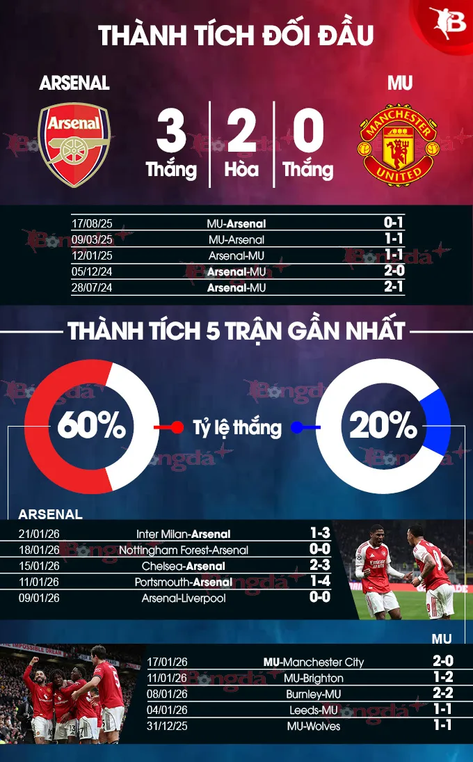- Cả hai cùng ghi bàn: 4/5 trận của MU và 3/4 trận của Arsenal gần đây đều có tình huống lập công từ cả hai phía.