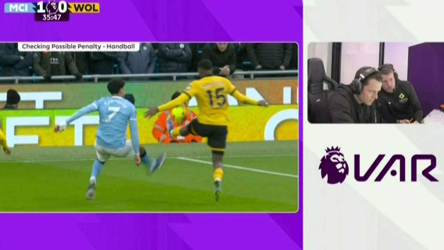 Tình huống xảy ra ở hiệp một khi Hallam, trên cương vị trọng tài chính Premier League đầu tiên, từ chối cho Man City hưởng phạt đền dù đã được VAR yêu cầu xem lại. Qua hệ thống loa, vị trọng tài 32 tuổi tuyên bố: "Bóng chạm tay trong tư thế tự nhiên". Quyết định này khiến Guardiola vô cùng phẫn nộ.