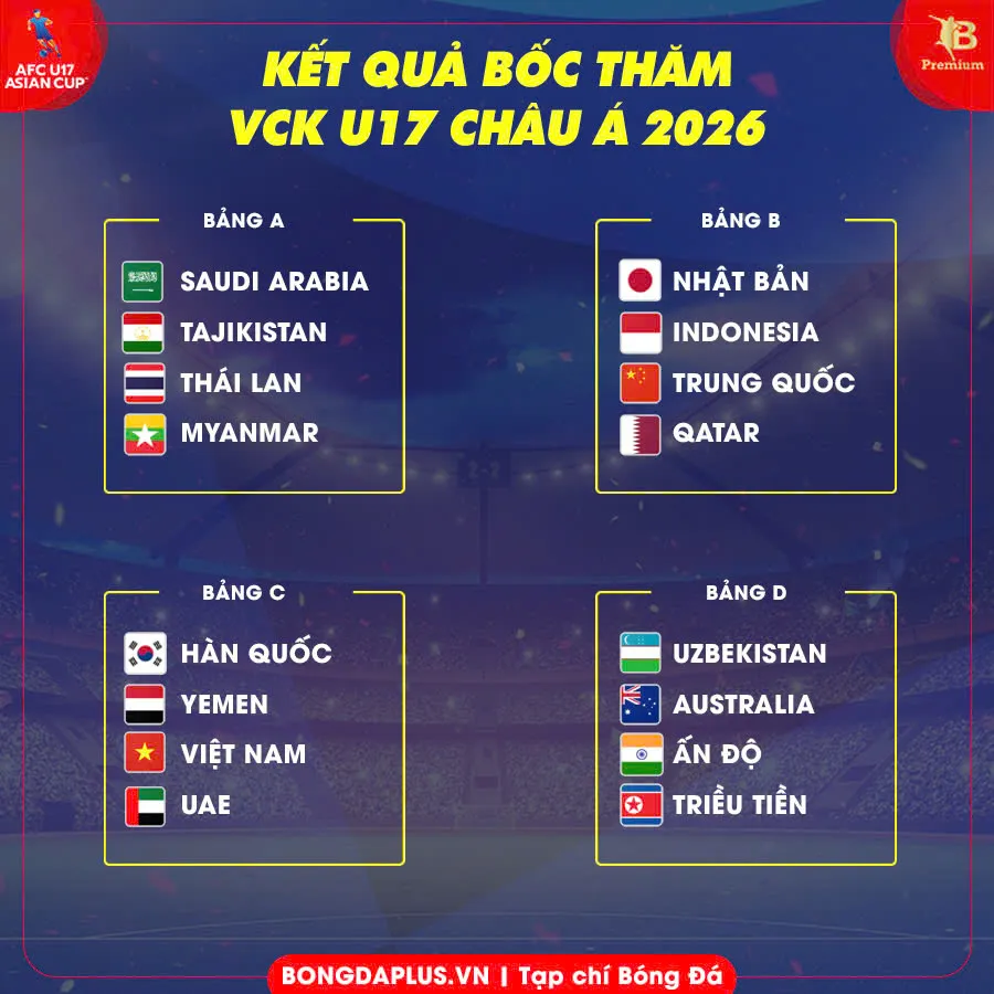 Trong khi U17 Việt Nam có bảng đấu được đánh giá cân bằng, thì các đồng minh Đông Nam Á khác phải đối mặt với thử thách lớn hơn. U17 Thái Lan nằm ở bảng A cùng chủ nhà Saudi Arabia, Tajikistan và Myanmar. Còn U17 Indonesia phải cạnh tranh vé đi tiếp ở bảng B với những gương mặt nặng ký như Nhật Bản, Trung Quốc và Qatar.